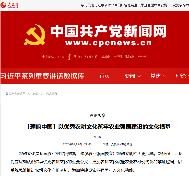 近日,人民网理论频道“独家特稿”栏目刊登我院张鹏老师的理论文章《以优秀农耕文化筑牢农业强国建设的文化根基》(原文链接:https://theory-people-com-cn.webvpn.bua.edu.cn/n1/2025/0826/c148980-40550206.html)。文章深入学习贯彻习近平新时代中国特色社会主义思想,系统阐述传承优秀农耕文化在农业强国建设中的时代价值与实践路径。文章指出,农耕文化是我国农业的宝贵财富,建设农业强国要立足农耕文明的历史底蕴,深刻把握传承优秀农耕文化对农业强国建设的多重意义。文章辩证分析农耕文化赋能农业农村现代化的内在机制,提出要在“两个结合”指引下,立足农耕文明的历史底蕴,系统推动农耕文化创造性转化、创新性发展,为农业强国建设注入深沉而持久的文化动能。